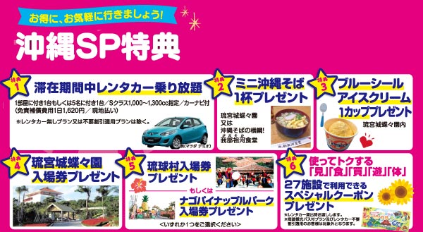 | 3 | 4 | 5 | 出発までフリータイム ホテルーレンタカー(Sクラス)付 ー返却後、那覇空港 【ご希望便】 ー伊丹・関西・神戸空港 |
